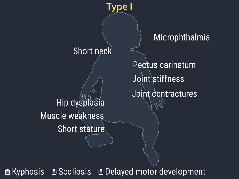 بیشتر بیماران با نوع ۱ سندرم شوارتز-جامپل دارای ناهنجاریهای استخوانی و کندرودیستروفی هستند که ممکن است در زمان تولد شناسایی شوند یا تا سن ۲ سالگی قابل توجه شوند. ناهنجاریهای اسکلتی اضافی ممکن است شامل میوپاتی میوتونیک (myotonic myopathy)، عضلات اسکلتی کوچک، انقباضات مفصلی، دیسپلازی لگن، کیفواسکولیوز (kyphoscoliosis) و پکتوس کاریناتوم (pectus carinatum) باشد. نوزادان ممکن است وزن تولد طبیعی یا پایین داشته باشند و سرعت رشد معمولاً در سال اول و دوم زندگی زیر حد نرمال باشد. بیماران ممکن است با تأخیر در توسعه حرکتی مواجه شوند که معمولاً پس از سن ۲ سالگی بهبود مییابد. توسعه ذهنی بهطور معمول طبیعی است. بیماران معمولاً به کوتاهی قامت غیرطبیعی در بزرگسالی (کوتولگی) دچار میشوند.